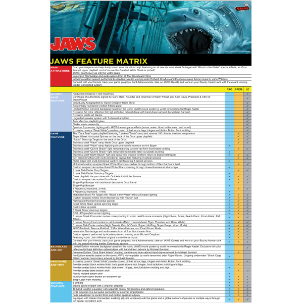 JAWS pinball machines are available in Pro, Premium, and Limited Edition (LE) models.